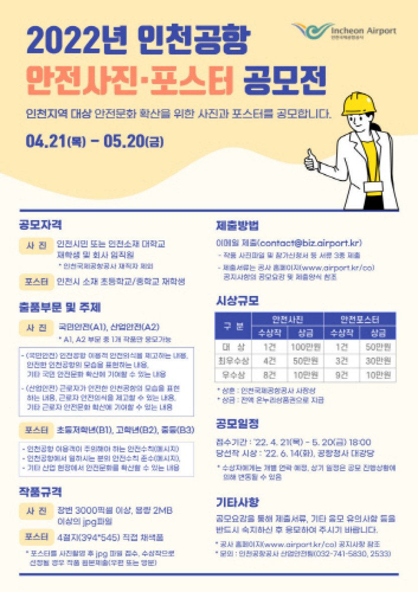 인천국제공항공사(사장 김경욱)는 지역사회 안전 가치 확산 노력의 일환으로 인천지역을 대상으로 '2022년 인천공항 안전사진·포스터 공모전'을 개최한다고 21일 밝혔다.공…