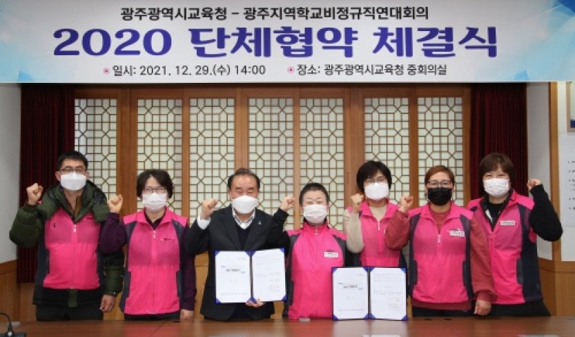 광주시교육청이 29일 중회의실에서 광주지역학교비정규직연대회의(전국학교비정규직노동조합,전국여성노동조합,전국공공운수노동조합)와 2020 단체협약 체결식을 했다.체결식은 장휘…