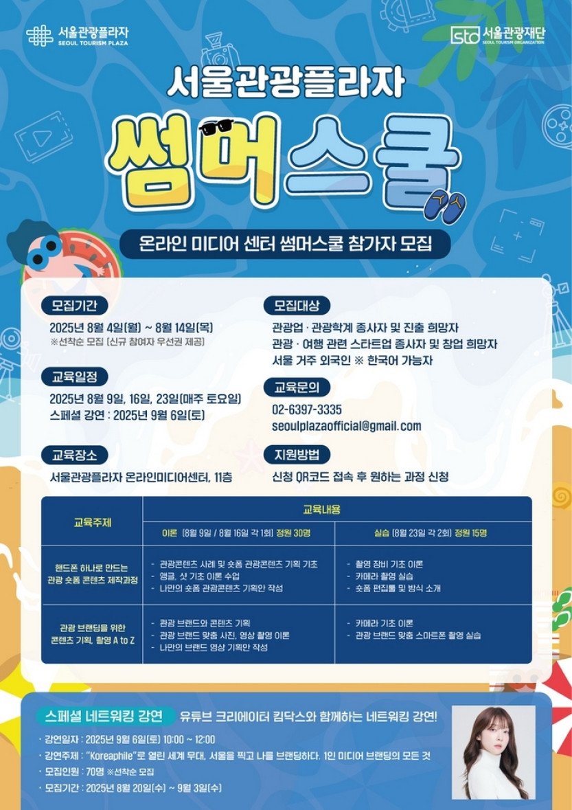 서울관광재단(대표이사 길기연)은 관광 콘텐츠 분야의 창의 인재 양성을 위해, '서울관광플라자 썸머스쿨'을 오는 8월 9일부터 9월 6일까지 운영한다고 밝혔다.썸머스쿨은 …