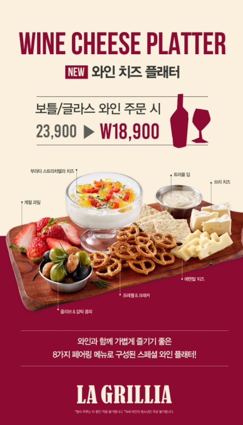 SPC 그룹이 운영하는 이탈리안 캐주얼 레스토랑 라그릴리아가 와인 치즈 플래터를 출시했다.와인 치즈 플래터는 치즈 3종(부라타 스트라차텔라 치즈·에멘탈 치즈·브리 치즈)…
