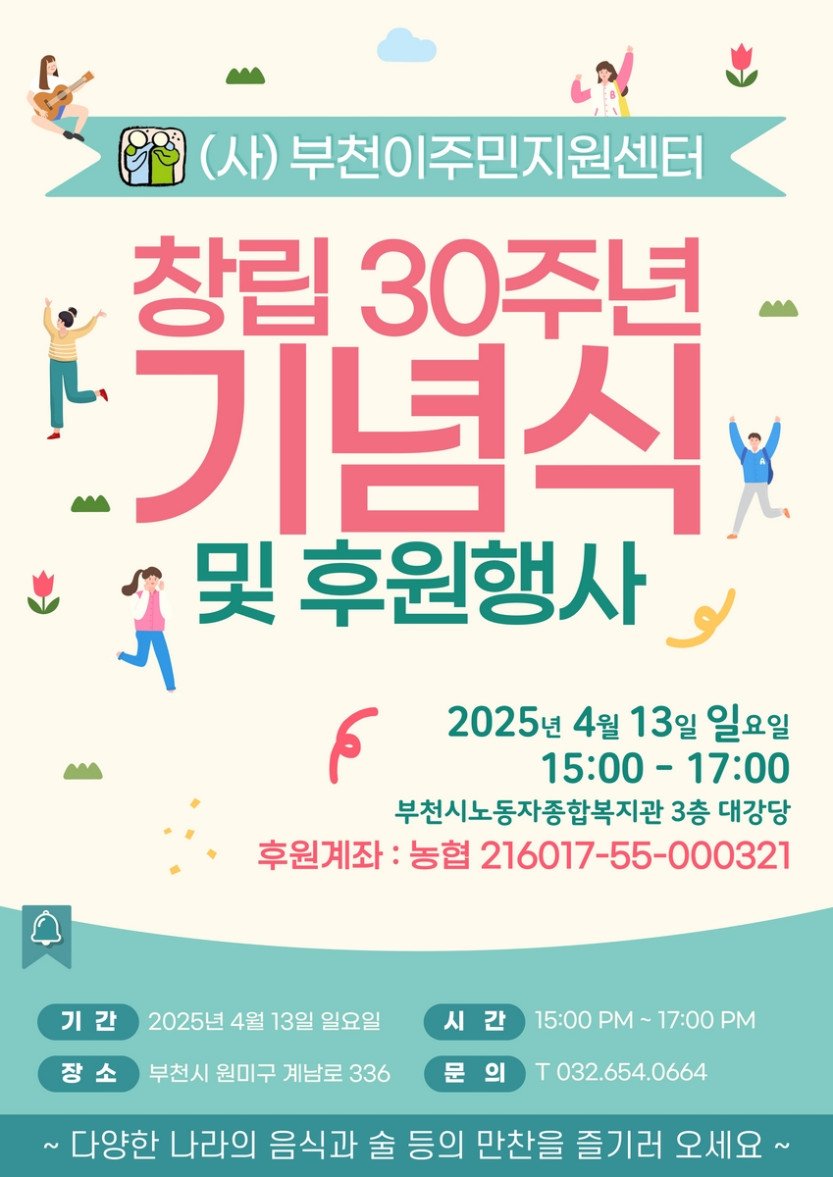 (사)부천이주민지원센터(이사장 임영담)는 창립 30주년을 맞아 오는 4월 13일(일) 15시부터 부천시노동자종합복지관 3층 대강당에서 「기념식 및 후원행사」를 개최할 예…