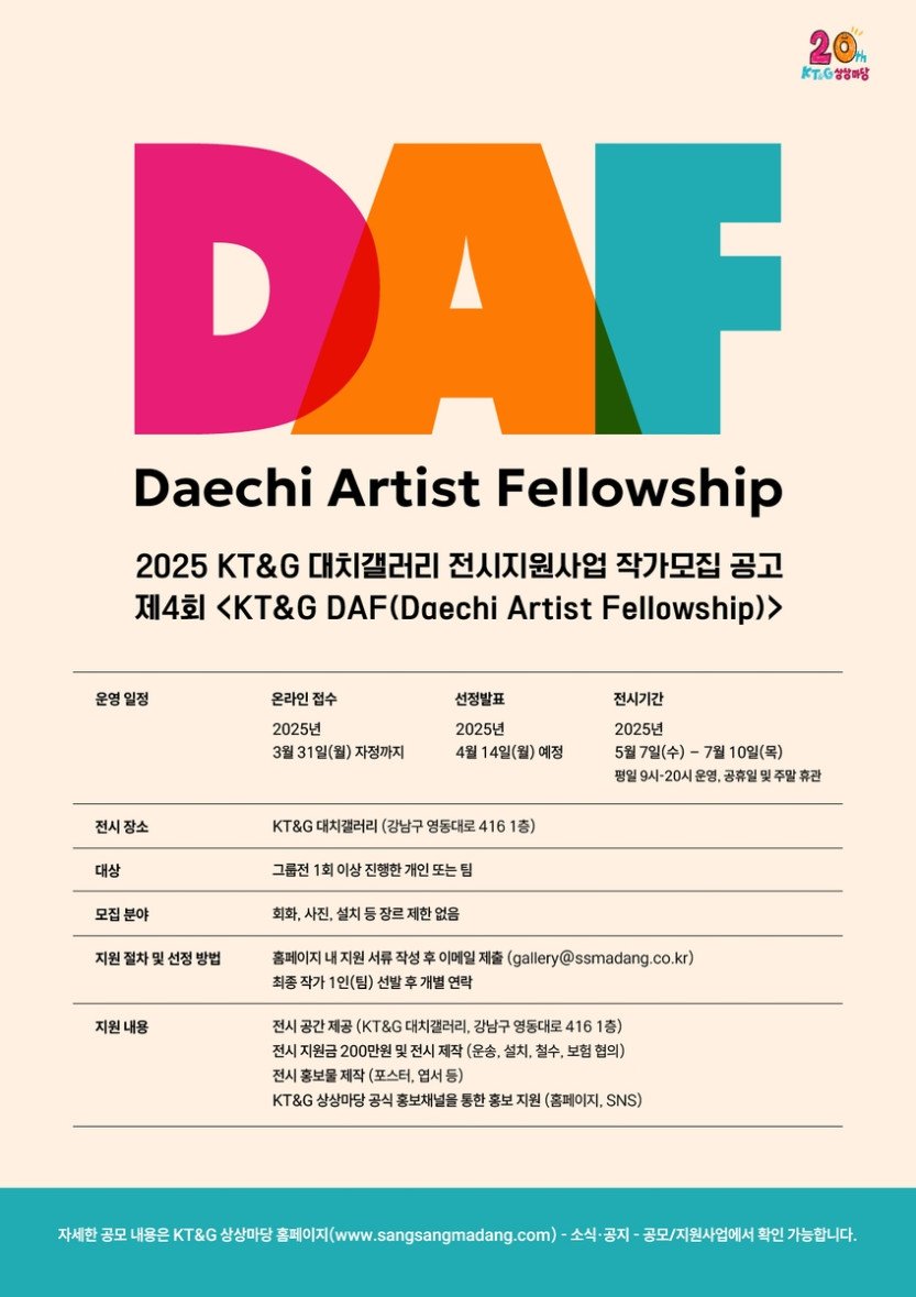 KT&G 상상마당이 신진 작가들의 전시 활동을 지원하기 위해 'KT&G Daechi Artist Fellowship(DAF)' 참가자를 오는 31일까지 모집한다.'KT&…