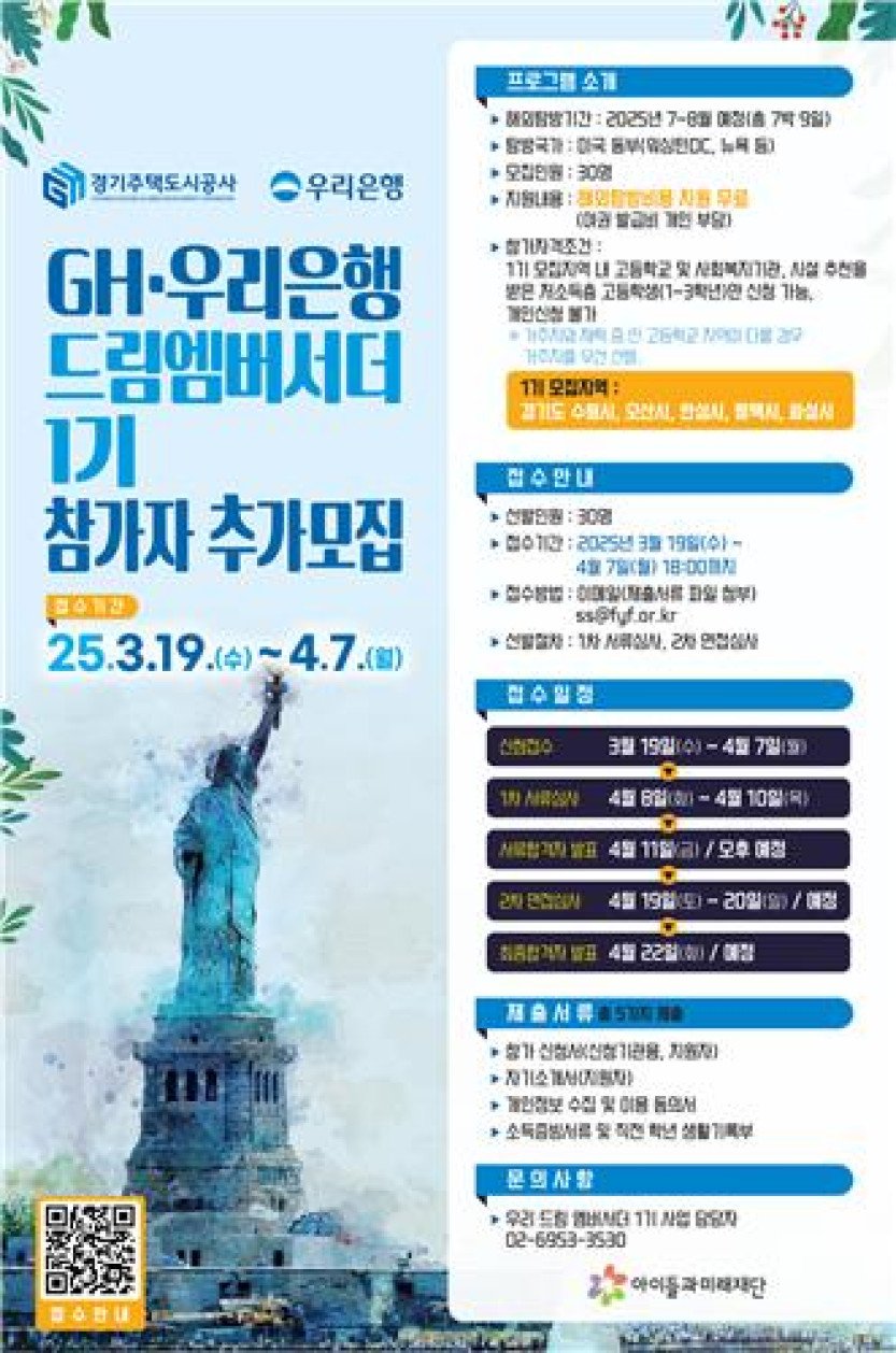 경기주택도시공사(GH)는 이달 21일 우리은행과 함께하는 사회공헌 협력사업인 고등학생 해외탐방 프로그램 '드림 엠버서더' 1기 참가자를 모집한다고 밝혔다.1기 모집인원은…