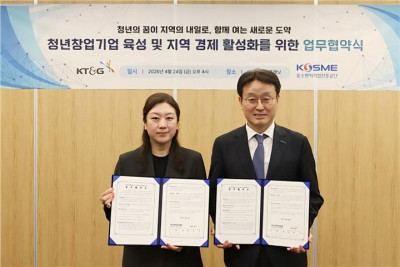 KT&G(사장 방경만)와 중소벤처기업진흥공단(이사장 강석진, 이하 중진공)이 서울 성수동 KT&G 상상플래닛에서 지역경제 활성화 및 청년창업 육성을 위한 업무 협약을 지난 24일 체결했다.