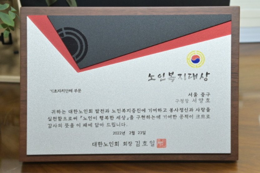 서울 중구(구청장 서양호)가 사단법인 대한노인회 주관 '2022년 노인복지대상'에서 대상을 수상했다고 24일 밝혔다.대한노인회는 노인의 권익 신장과 복지증진, 사회참여 …