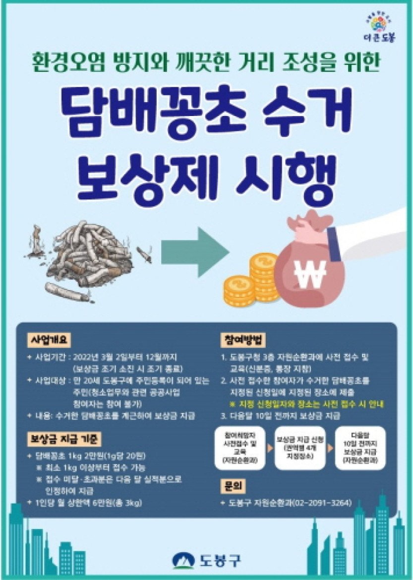 도봉구, 2022년 3월부터 담배꽁초 수거보상제 시행