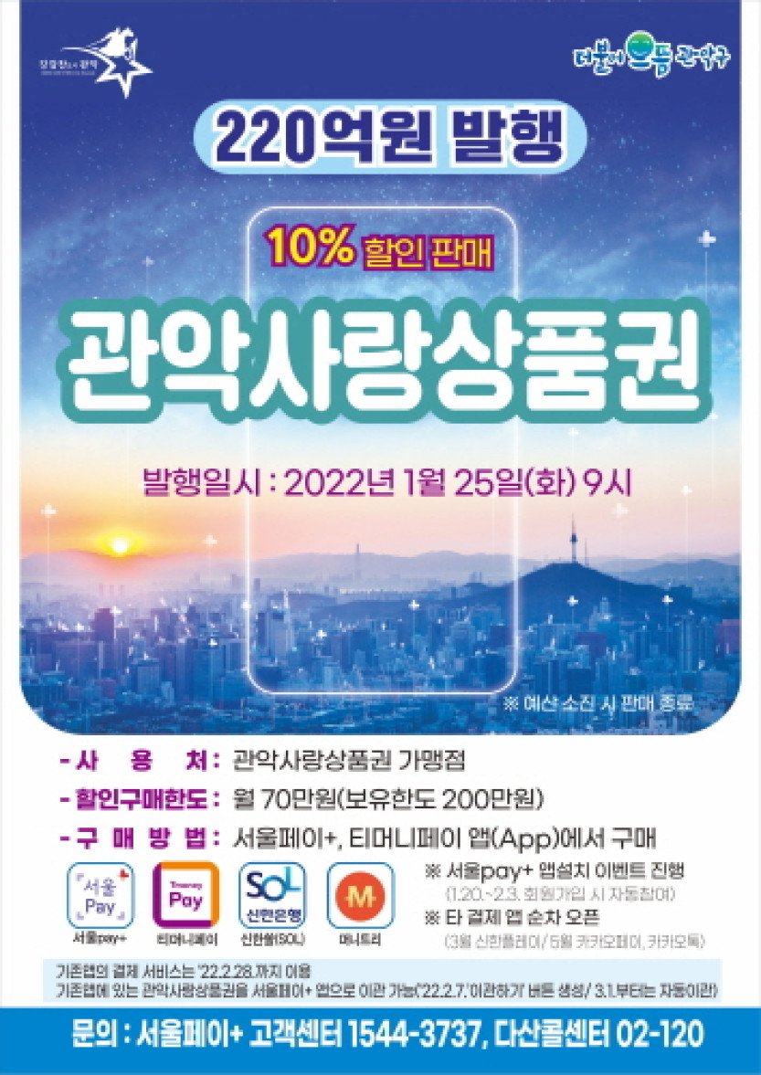 서울 관악구(구청장 박준희)가 설 명절을 맞아 25일 오전 9시부터 관악사랑상품권 220억 원을 발행한다고 밝혔다.구는 그간 코로나19 장기화로 침체한 지역 상권 활성화…